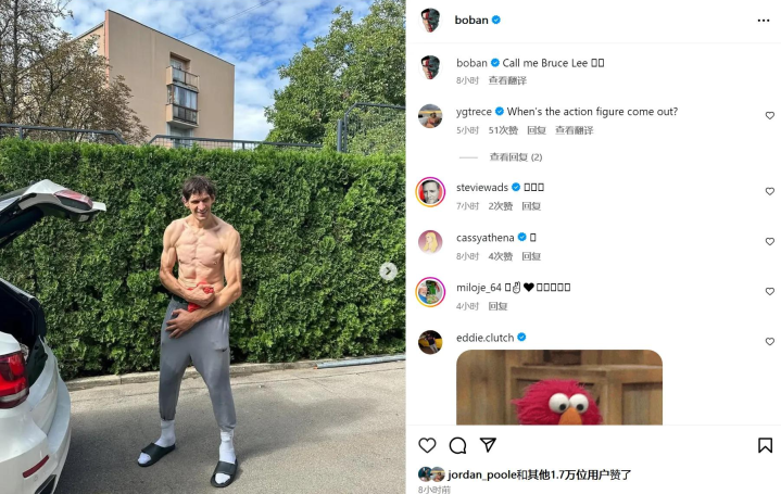 近期博班估计也知道要无球可打了,在社媒上晒了两张赤膊的照片,这肌肉线条真的很夸张。博班还配文写道:“请叫我李小龙!”