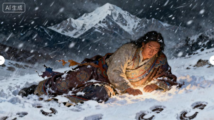 数月后,赤松德赞奉命前往山南地区巡查粮田。途中,他们遭遇了一场突如其来的暴风雪,马匹受惊狂奔,赤松德赞与随从失散,独自一人被困在雪山深处。寒风如刀割般刮在脸上,他的手脚渐渐失去知觉,意识也开始模糊。