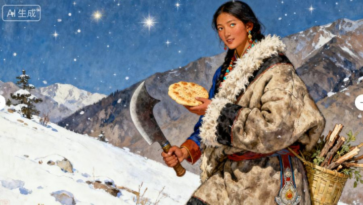 赤松德赞费力地睁开眼,看到一个身着羊皮袄的女子,正背着竹篓,手持柴刀站在不远处。女子约莫十八九岁,皮肤是健康的麦色,眼眸亮得像雪地里的星星。她见赤松德赞冻得奄奄一息,立刻放下竹篓,将自己的羊皮袄脱下来裹在他身上,又从竹篓里掏出烤得温热的青稞饼,递到他嘴边。