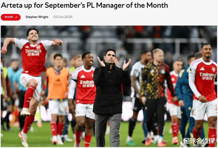 官方:阿尔特塔被提名为了英超9月份最佳主帅候选。