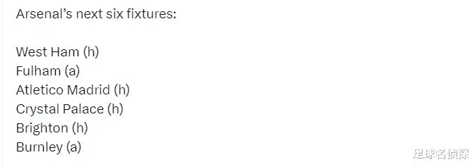 阿森纳未来6场比赛:主战西汉姆、客战富勒姆、主战马竞、主战水晶宫、主战布莱顿、客战伯恩利。