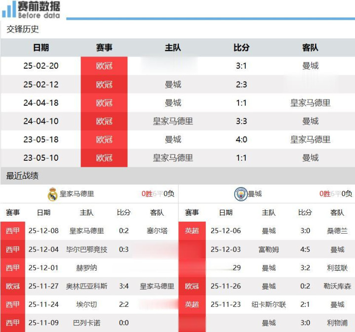 北京时间12月11日凌晨4时,欧冠联赛阶段第6轮迎来一场强强对话,皇马主场迎战曼城。